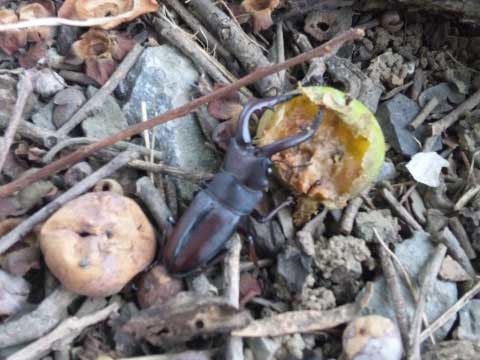 落ちた未熟なのに熟れてる柿の実(笑)が目当てなのか、真っ昼間だというのに立派なクワガタくんを発見しました(2匹いました)。