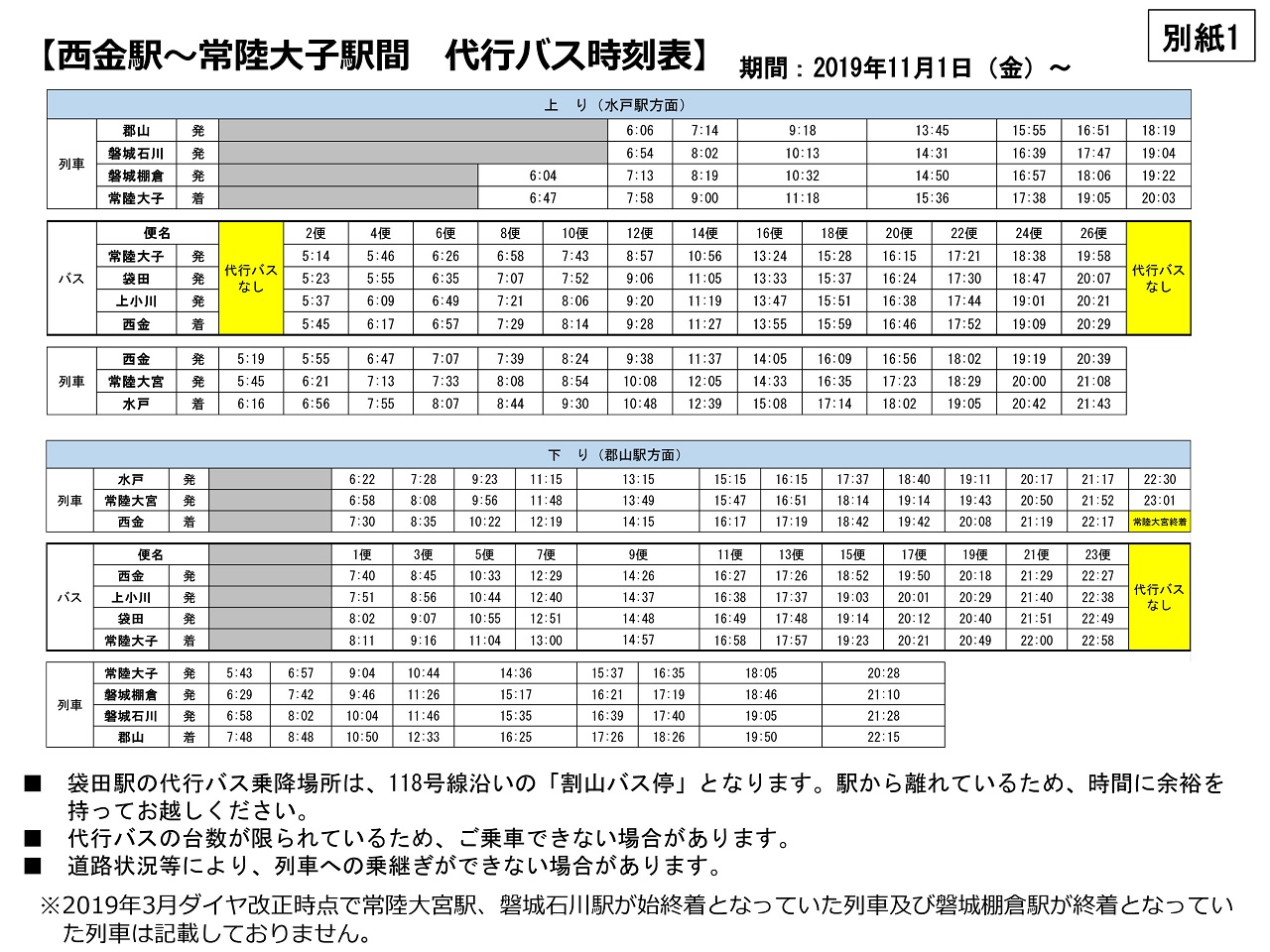 ▲11月1日以降の水郡線ダイヤ。西金~常陸大子間は代行バスです。(JR東日本 水戸支社の発表より)