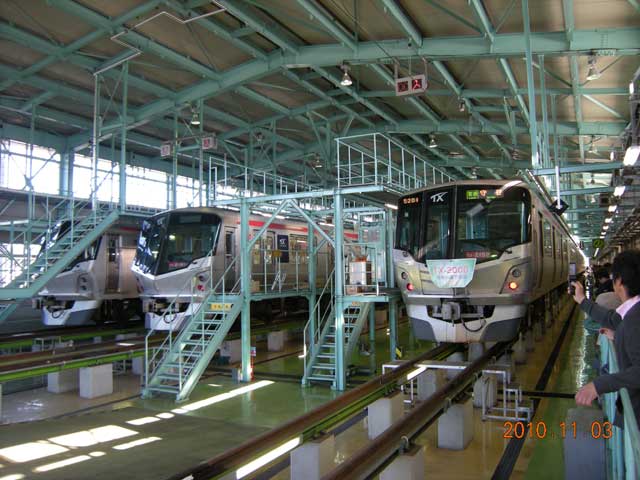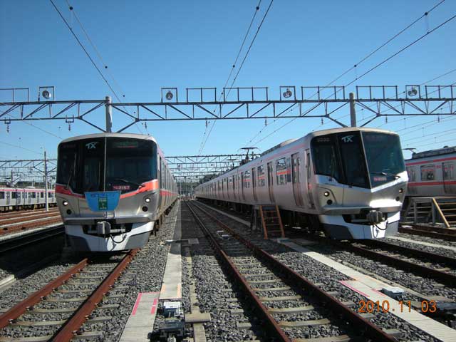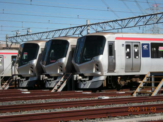 留置線には、鋭角的な先頭形状が魅力の「TX-1000系」と「TX-2000系」が並んでいます。