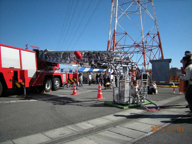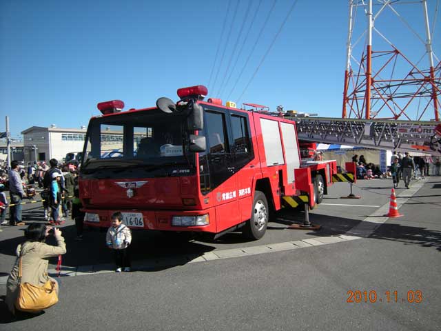 基地の入り口でバスを降りると、スタンプラリーの大行列が。それを横目に留置線の方に向かうと、大きなはしご車やパトカー、白バイがお出迎え。