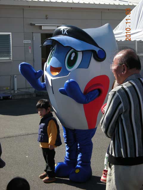 ▲ 今年も晴天に恵まれた「つくばエクスプレスまつり」。まずは「スピーフィ」の着ぐるみと、はしご車、パトカー、白バイのお出迎え。(クリックすると拡大画像を表示します)。
