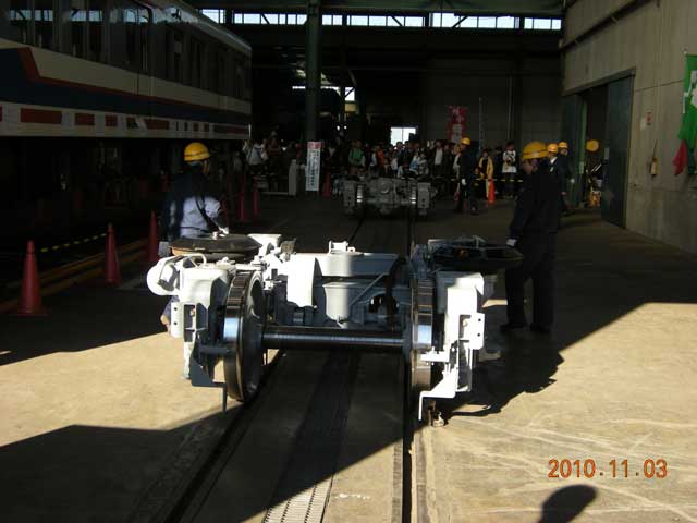 クレーン実演では、クレーンで持ち上げた車体を台車に設置する寸前までの状況を公開していました。