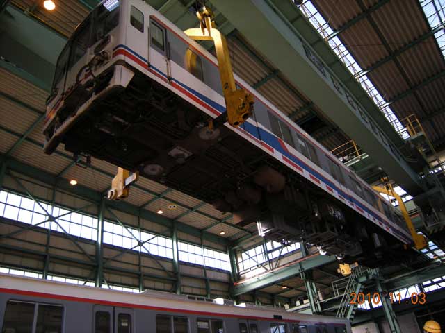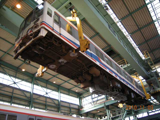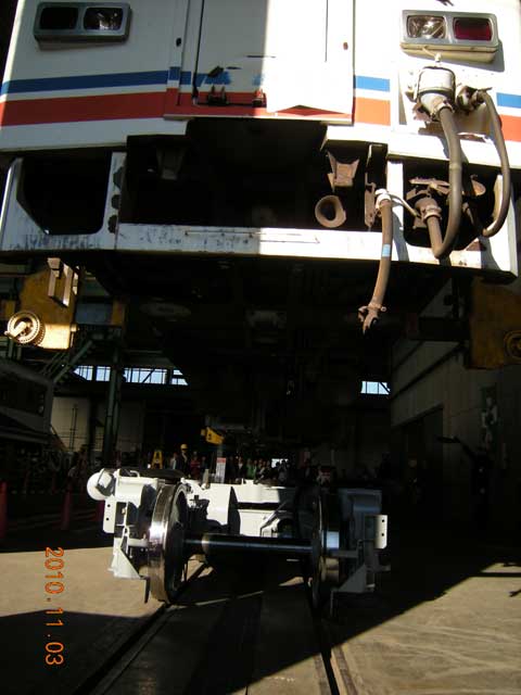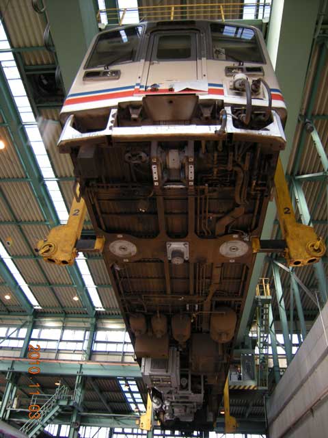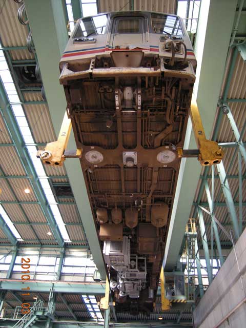 ▲ 台車の上に車体が下りてきます。台車に近づくと、微調整で少しずつ下げていきます。(クリックすると拡大画像を表示します)。