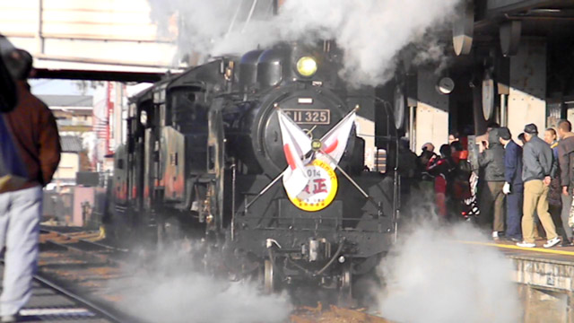 ▲ 真岡駅に戻ってきた「C11 325」と「C12 66」。往路とは異なり、背中合わせでの重連でした。(クリックすると動画を再生します)