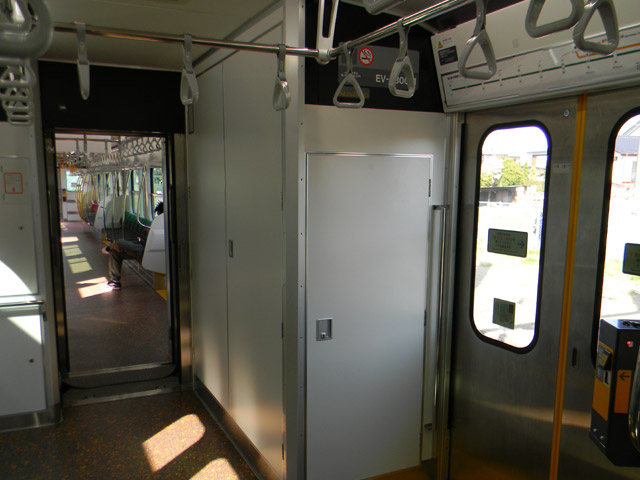 ドアは両開き・3ドアで、連結面寄りのドアには整理券発券機が設置され、一見するとトイレのような機器室も。