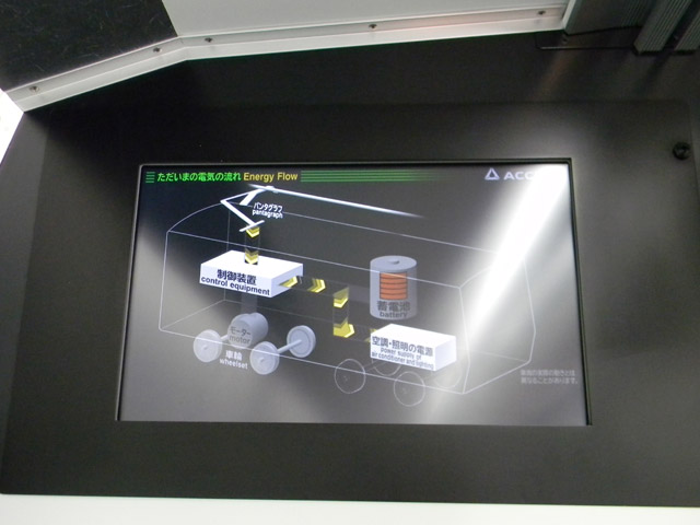 ▲ 車内にはバッテリー駆動システムを説明する液晶パネルも。(クリックすると拡大画像を表示します)