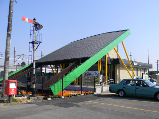 ▲ 大胆なデザインの駅舎の隣には、腕木式信号機も。(クリックすると拡大画像を表示します)