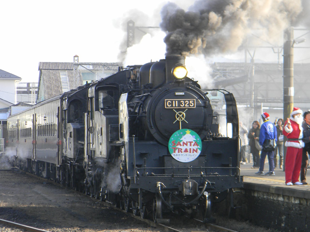 ▲ 今年は残念ながら運転中止になってしまった「サンタトレイン」(この画像は2010年運転時/SL重連)。その代わり、「キューロク館でサンタと遊ぼう!!」を開催!!(クリックすると拡大画像を表示します)