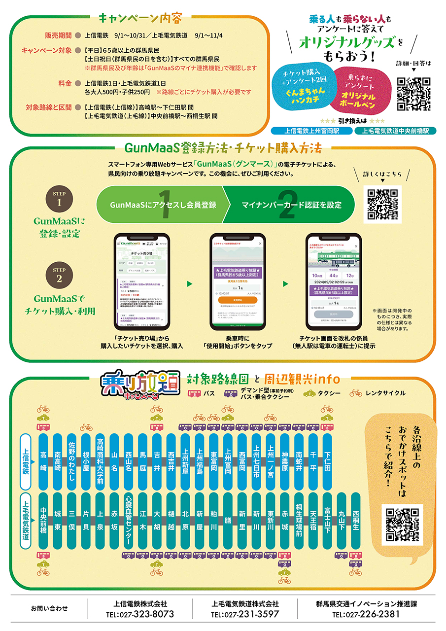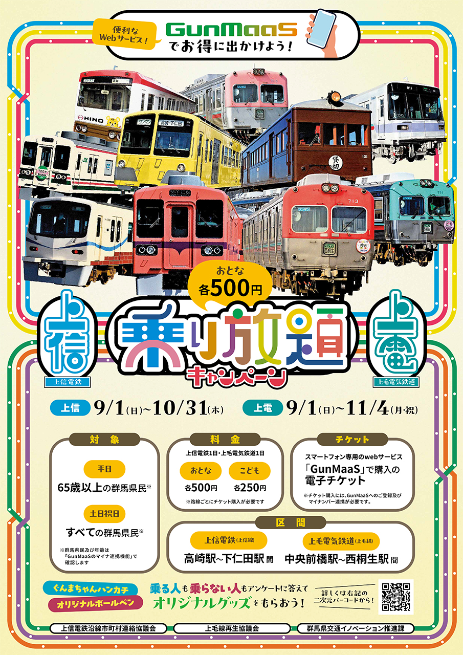 (3)については、それぞれの事業者が独自で行うより、共同で実施する方が効率的だと思います。共同キャンペーンは、2024年秋に群馬県民を対象に実施した「上信電鉄・上毛電気鉄道1日500円乗り放題キャンペーン」という前例があります。スマホアプリ「GunMaas(グンマース)」を利用する電子チケットで、駅や車両側に新規のインフラ投資を行う必要がないことから、今後こうしたサービスの拡充を行っていくのかも知れませんね。