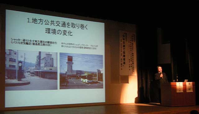 最初の講演は、シンポジウムのコーディネーターでもある交通ジャーナリスト・鈴木氏による地域公共交通についての講演。