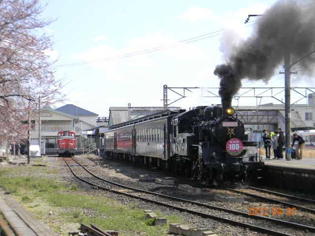 ▲ 真岡駅からは「C11」が先頭に立ち、最後尾には「DE10」が連結されています。(クリックすると拡大画像を表示します)