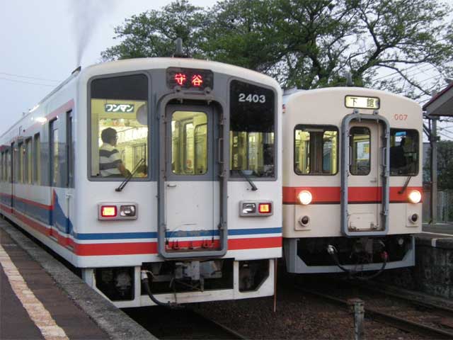 待つことしばし、下館からの守谷行きの「キハ2403」単行とすれ違う格好で、下妻方から当該列車がやってきました。